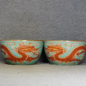雍正御制高档松石绿釉矾红描金双龙戏珠纹茶碗一对,胎体细腻高档,画工精湛高超,官窑烧制,货色精美。