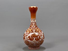 清乾隆矾红描金连年有余纹蒜头瓶27/13.5