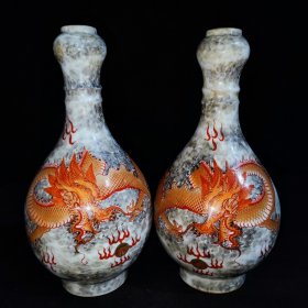 清乾隆,墨彩加矾红描金龙蒜头瓶一对
