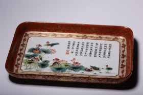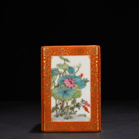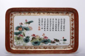 清代,“大清乾隆年制”矾红描金开窗粉彩荷塘鸳鸯纹四方水洗