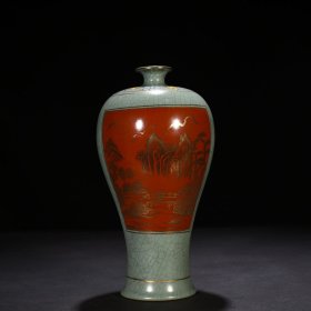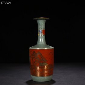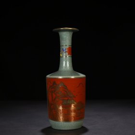 宋政和二年款汝窑天青釉纸槌瓶后乾隆乾隆矾红描金山水30*14厘米