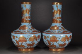 元矾红描金孔雀花卉纹玉壶春瓶36*20厘米aa