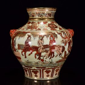 老物件元矾红描金昭君出塞纹虎头罐