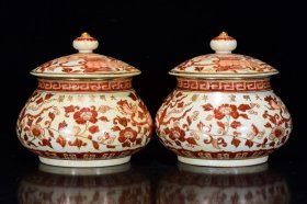 老物件明宣德年矾红描金凤纹盖罐