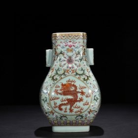 瓷器 清乾隆粉青釉粉彩花卉开窗矾红描金龙纹贯耳方瓶 30*18厘米