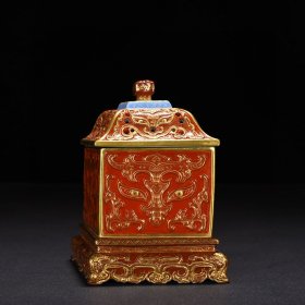 瓷器 清乾隆矾红描金雕刻饕餮纹菱形镂空熏炉 15*12厘米