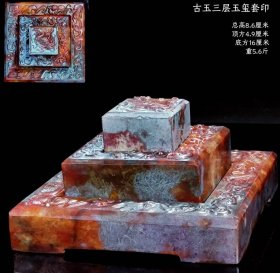 古玉神兽龙纹大印章,和田玉玉玺·皇帝御用印章,和田玉印章·三层玉玺套印,玉质细腻,上雕玄武神兽图案,下饰螭龙纹,雕工精湛,沁色精美,品相一流,博物馆级别藏品