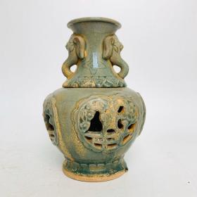 越窑青釉镂空盘口瓶