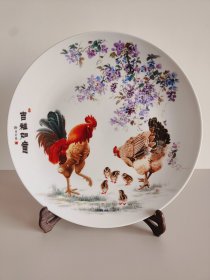 景德镇陶瓷艺术名人作品,徐孝正书,王玲影绘,瓷盘直径约35.5cm,精美高档实木支架,精美包装盒,带收藏证书。作品精致,典雅大气,制作极其精美细腻。绘画书写皆可圈可点。艺术气息和文化内涵俱佳,紫藤花寓意紫气东来,栩栩如生的大小雌雄鸡,寓意大吉大利、和谐团圆,同时鸡有五德。纯手绘瓷器。观赏装饰效果极好,收藏价值极高。
