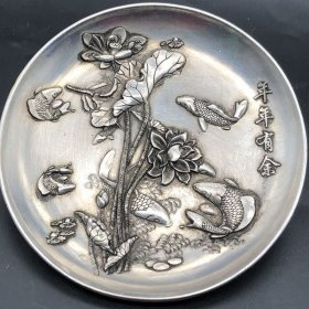 古玩杂项收藏 年年有余盘子 荷花鱼鎏银铜盘碟子茶托家居摆件铜器