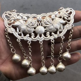 古玩杂项收藏大清乾隆年制镀银双狮闹绣球银锁特价
