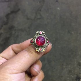 古玩杂项藏银足银镶嵌上等天然红宝石民族风活口戒指指环