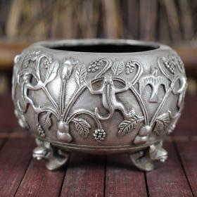 古玩杂项收藏仿古铜器白铜鎏银书房居家摆件精品工艺品鸽子三脚缸