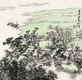 B41220号国画 写意山水人物行舟 56×46cm 作者:余白墅,生于1920年12月3日,浙江慈溪人。是上海书画出版社编辑部主任,上海版画会顾问、中国美术家协会与中国版画家协会会员。1991年中国美术家协会、中国版画家协会为表彰30、40年代在中国新兴版画事业中有贡献的版画家,授予他“新兴版画纪念奖”。秋水碧于玉。远山翠欲浮。高人谢城郭。诗思落扁舟。