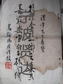 民国宁波乡绅蔡汉章先生像赞书中两页。 蔡汉章,为宁波鄞东潘火桥蔡氏,家风和睦,注重公益。曾经是鄞东乡绅,赈灾放粮,免除贫民债务,关爱乡民。 题词人,冯度,书法家。宁波慈溪人。1911年毕业于浙江高等学堂(今浙江大学),1927年任效实中学校长,直至1949年。 冯中銞,民国宁波鄞州区正始中学校董会董事。。