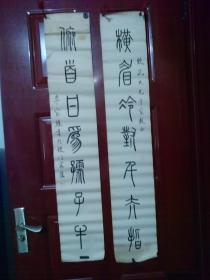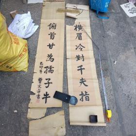 老书法对联:曾文芳书《横眉冷对千夫指,俯首甘为孺子牛》内尺寸109*21cm(包老)