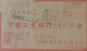 盖1992年12月15日河南平顶山火车站支国内邮资已付戳的联行快件挂号封,改退批条盖1992年12月19日湖北宜昌443000(投)日戳(信封背面亦有此戳)。
