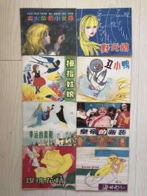 安徒生童话精选彩色连环画8册全:玫瑰花精、卖火柴的小女孩、野天鹅、幸运的鞋套、皇帝的新装、海的女儿、丑小鸭、拇指姑娘【封底有笔记如图,其中一本书角小损如图,无盒】