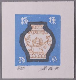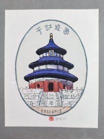 著名版画家、曾任中国藏书票研究会会长,中央美术学院版画系教授 梁栋 1990年套色木刻《王朝闻藏书》藏书票一张,出版于《书魂-梁栋 鹏程藏书票作品选》
