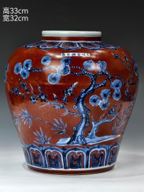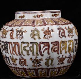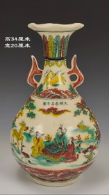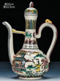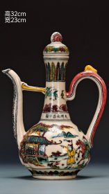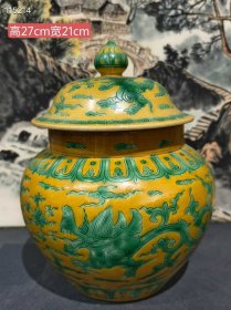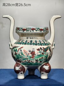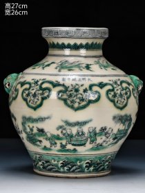 “大明正统年制”釉下绿彩“婴戏图”人物故事纹兽首贯耳罐。 此釉下绿彩釉水肥腴,釉层晶莹,柴烧气泡肉眼可见,彩料釉下沉淀肉眼可见,器形端庄周正,难得佳品!