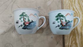 湖南陶瓷研究所出品两支精品釉下五彩陶瓷杯 釉下五彩经1380℃高温烧制,色彩永不褪色,釉面如脂似玉 手绘笔触细腻,松树纹理、人物动态皆自然逼真 釉面光洁,图案清晰生动。 底款湖南陶瓷研究所开门老物件