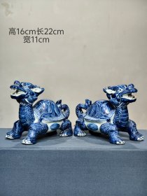 167_“大明宣德年制”仿生瓷青花“赑屃”一对,通体“苏麻离青”钴料绘制,见釉表“反铁”现象并伴随出现的浑浊晕散状釉下沉淀贴近胎骨现象,器形别样,规格适中,少见之良品。