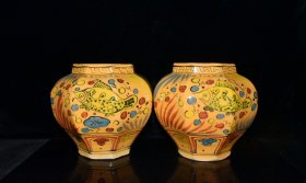 唐代釉下五彩鱼草纹八方罐一对