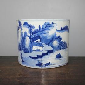 清青花山水田园笔筒釉下彩民窑