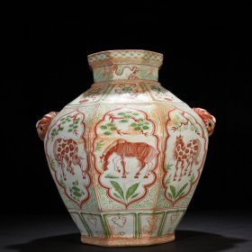元釉下红绿彩八骏马兽耳八方罐