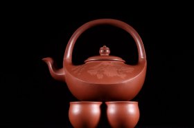 诗文刻绘日月同辉套组提梁紫砂壶 款识:一粟 毛国强 当代名家 壶高 16.5×20.3杯高 4.8口径6cm
