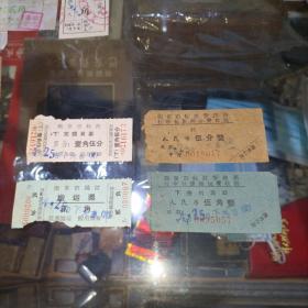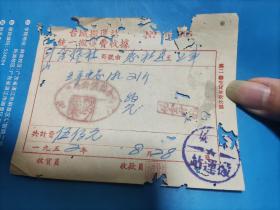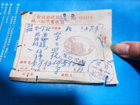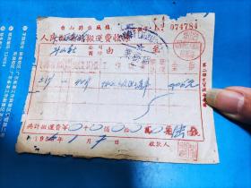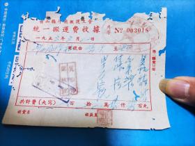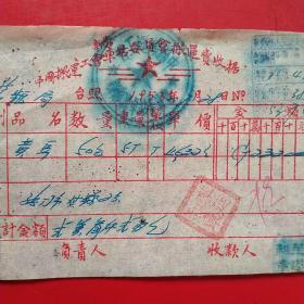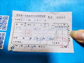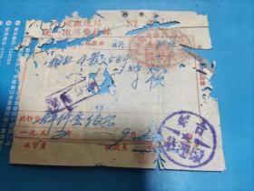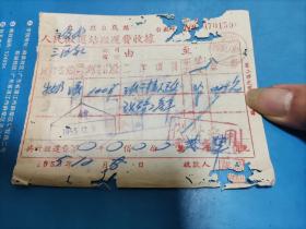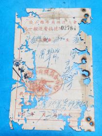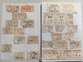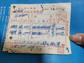 1954年粮食搬运票据110克(乾县薛录镇供销合作社章、乾县薛录镇粮食交易市场章、张朋翎、长途电话费收据、乾县群众运输队收据、中国搬运工会武功县普集车站搬运费收据、乾县临平镇粮食交易市场章等内容)