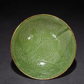宋代瓷器精品老货收藏 宋定窑绿釉鹭鸶花鸟纹碗镶嵌铜口