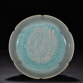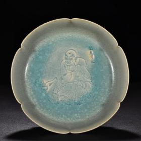 宋代瓷器精品老货收藏 宋汝窑天青釉冰裂纹骑鹿罗汉葵口盘