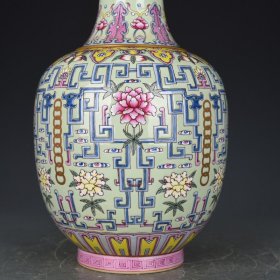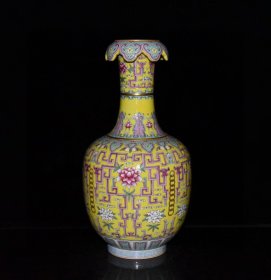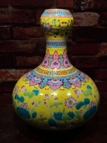 旧藏珐琅彩瓷器黄地釉荷花花卉算头口胆瓶 彩釉 荷花花卉 如意纹 蕉叶纹 回旋纹 蒜头口 釉色肥厚 浆体环绕 满功花卉 细纹开片 饰松石绿 高度280mm 直径215mm 重量2210g 四斤半