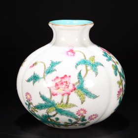 珐琅彩瓷器黄地釉开窗花鸟花卉蒜头口赏瓶 开窗花鸟 釉色肥厚 浆体环绕 大瓶 宝篮花卉 满功花卉 细纹开片 饰松石绿 高度430mm 直径245mm 重量4120g 八斤二两