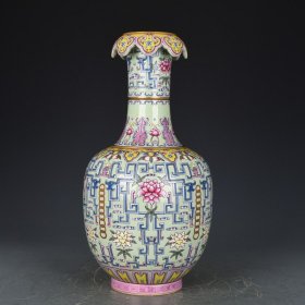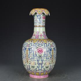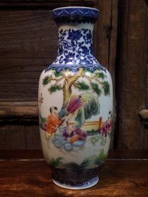 珐琅彩瓷器童趣花卉题诗文赏瓶 青花花卉 描金口 婴戏图 题诗文 如意纹 青花缠枝莲花卉 釉色肥厚 浆体环绕 满功 高度223mm 直径106mm 重量490g