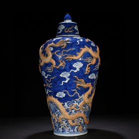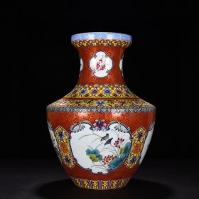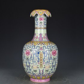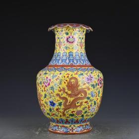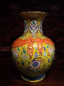 旧藏珐琅彩瓷器黄地釉花卉系带瓶 花口 福在眼前 如意纹 红釉系带 兰釉璃龙花卉 釉色肥厚 浆体环绕 满功花卉 细纹开片 饰松石绿 高度325mm 直径230mm 重量3800g 七斤六两