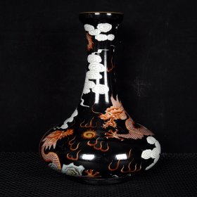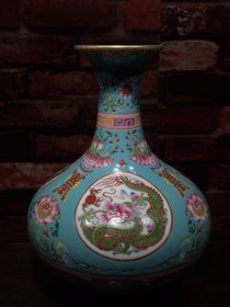 珐琅彩瓷器兰地釉开窗龙纹花卉祝寿胆瓶 彩釉 祝寿花卉 如意纹 回旋纹 侈口 釉色肥厚 浆体环绕 满功花卉 细纹开片 饰松石绿 高度275mm 直径215mm 重量2170g 四斤三两