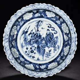 瓷器 元蓝地青花唐太宗人物纹菱口折沿盘 高8.5厘米 宽45.8厘米