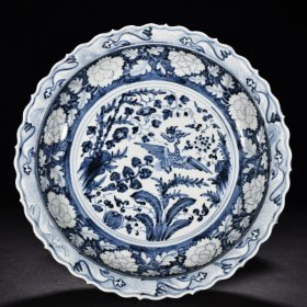 瓷器 元蓝地青花花卉凤纹菱口折沿盘 高8.5厘米 宽45.8厘米