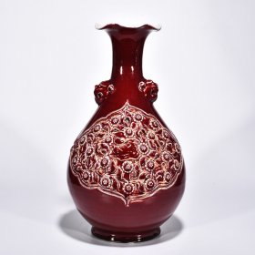 瓷器 元霁红釉贴塑鸳鸯花卉纹兽耳花口玉壶春瓶 高45厘米 宽22厘米
