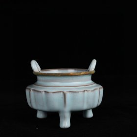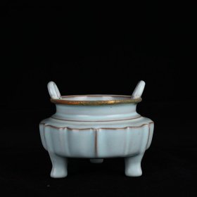 瓷器 宋汝窑修内司款三足炉镶嵌铜口 10*11厘米