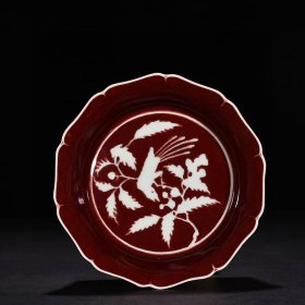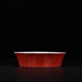 瓷器 明宣德宝石红釉刻折枝花鸟纹葵口洗 5×19厘米