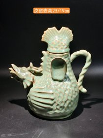 老旧藏,汝窑壶 高23厘米,口沿直径19厘米,属中型执壶。壶身塑造成龙形,龙首为流(壶嘴),龙尾卷曲成鋬(把手),壶盖设计为贝状钮,整体造型融合生物意象与实用功能。龙形设计象征权威与祥瑞,汝窑釉色体现宋代文人审美中的“含蓄淡雅”,整体反映仿古瓷器对传统文化意象的传承。