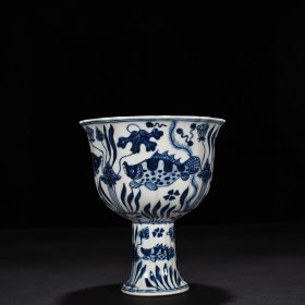 瓷器 明宣德青花鱼藻纹葵口高足碗 17*15厘米