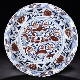 瓷器 明宣德釉里红鱼藻纹菱口折沿盘 8*42厘米