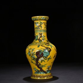 瓷器 清雍正黄地素三彩五福九桃纹盘口瓶 30*15厘米