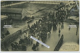 清末光绪皇帝出北京紫禁城故宫前往天坛祭天老明信片一张。雨停后不久,大清门南侧不远处,棋盘街的地面还可以见到水迹。帝王出行时,设仪仗扈从,前拥后簇,车乘相衔,旌旗招展,充分显示帝王至尊的地位
