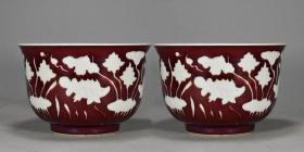 大明宣德年制 霁红釉蒲白雕刻鱼穿莲花碗 高11厘米 直径16厘米