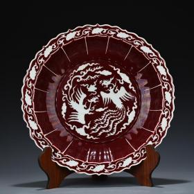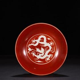 明成化红釉刻白龙纹盘4.5*20.8